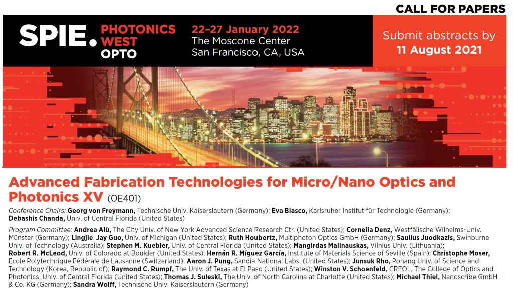 Topic 1: Advanced Fabrication Technologies for Micro/Nano Optics and Photonics XV.