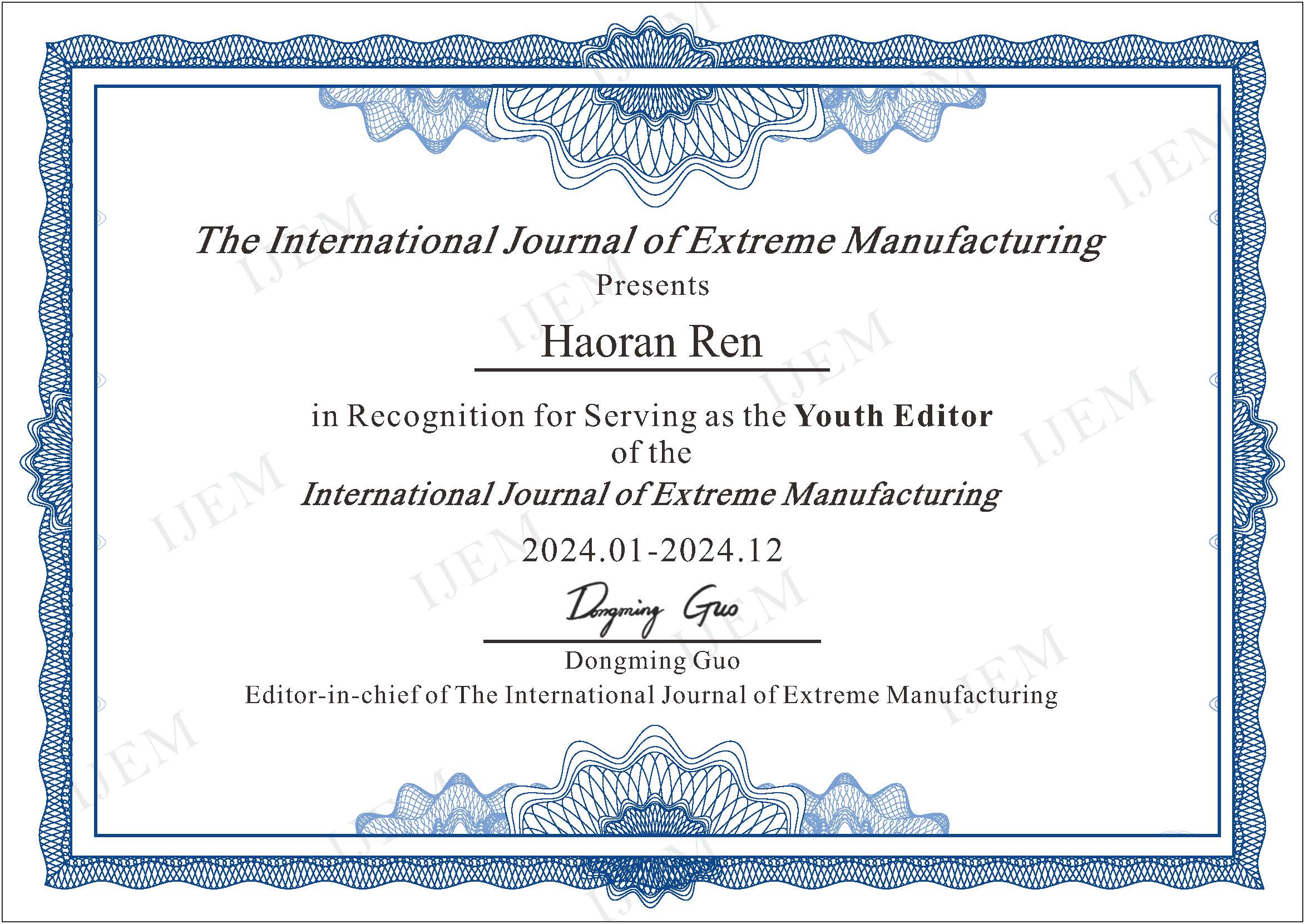 Haoran is selected as a Young Editorial Board Member for International Journal of Extreme Manufacturing.